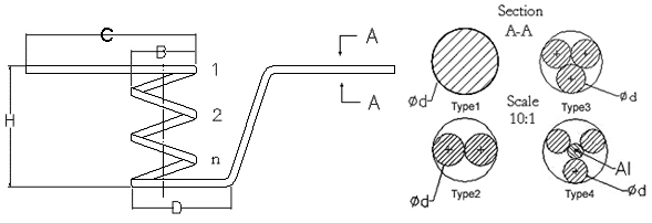 该加热子产品是线圈直径渐进型的加热子,线圈的数量和直径大小可根据客户要求定制。 希望在我们的网站您能找到适合你的规格或图纸。如果没能找到也没关系,请直接联系我们,并告诉我们您具体的要求和图号。 电话: 0592-5129696;传真:0592-5129797 |
